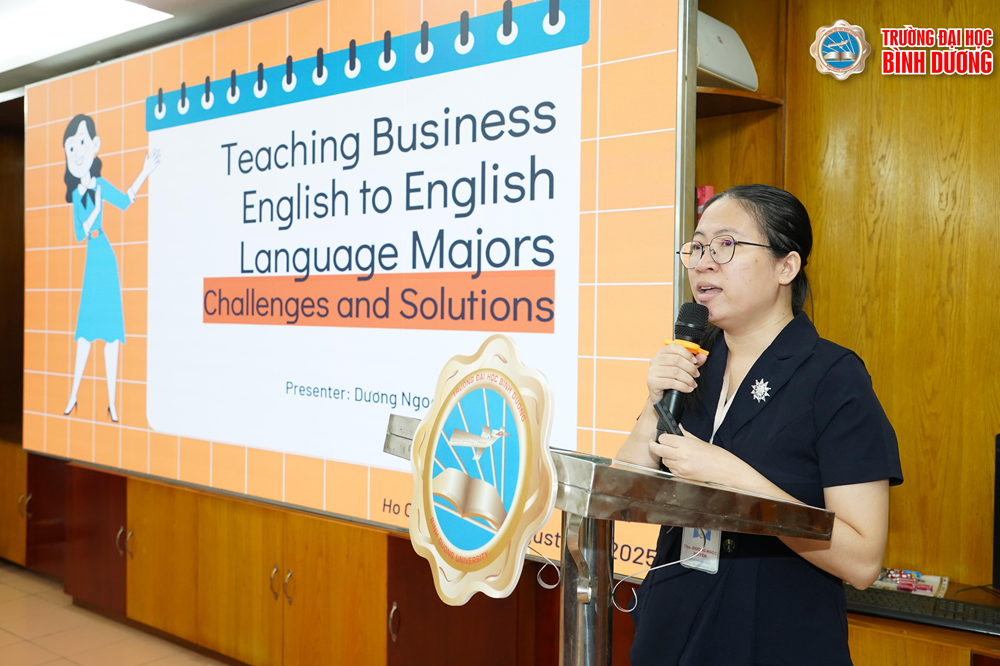 Đầu chương trình, hội nghị đã lắng nghe phần báo cáo tham luận chuyên đề “Kinh nghiệm và phương pháp giảng dạy tiếng Anh thương mại – Văn phòng” do ThS. Dương Ngọc Huyền trình bày. Bài báo cáo đã chia sẻ những kinh nghiệm thực tiễn quý báu cùng phương pháp giảng dạy hiệu quả, đồng thời chỉ rõ các khó khăn, thách thức trong hoạt động giảng dạy các học phần chuyên ngành. Các nội dung trọng tâm của tham luận đã nhận được sự quan tâm, thảo luận sôi nổi từ các giảng viên tham dự. Tham luận cũng đưa ra một số đề xuất về đổi mới hoạt động giảng dạy tiếng Anh thương mại nhằm nâng cao chất lượng đào tạo và đáp ứng yêu cầu thực tế của thị trường lao động hiện nay.