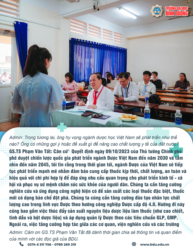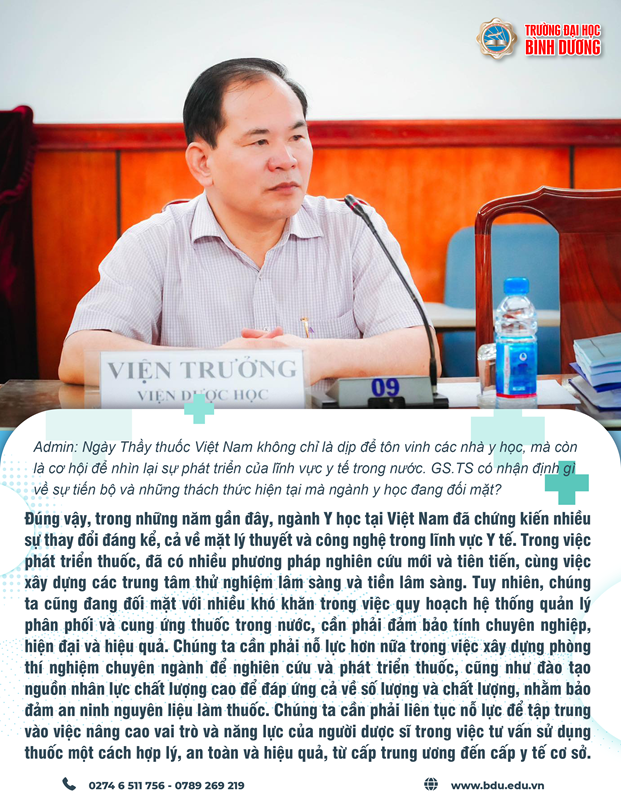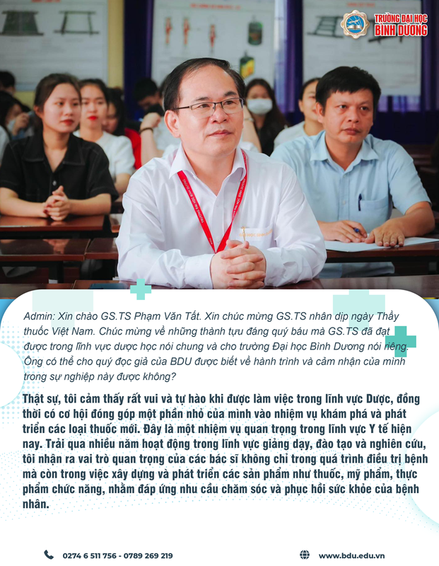 Nhân dịp kỷ niệm 69 năm ngày Thầy thuốc Việt Nam. Ban Biên tập rất vinh dự được phỏng vấn Giáo sư, tiến sĩ Phạm Văn Tất, Viện trưởng Viện Nghiên cứu Dược học, trường Đại học Bình Dương. Giáo sư Tất đã có đóng góp rất nhiều cho lĩnh vực y học và được tôn vinh vì những thành tựu xuất sắc trong sự nghiệp của mình. Chúng ta hãy cùng khám phá câu chuyện và góc nhìn của giáo sư, tiến sĩ về ngày này đặc biệt.